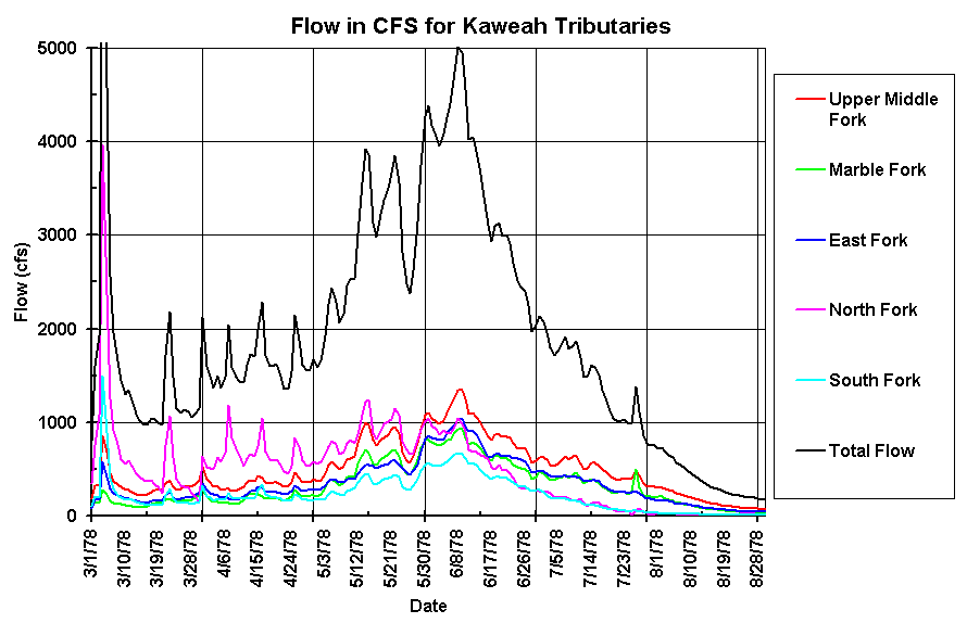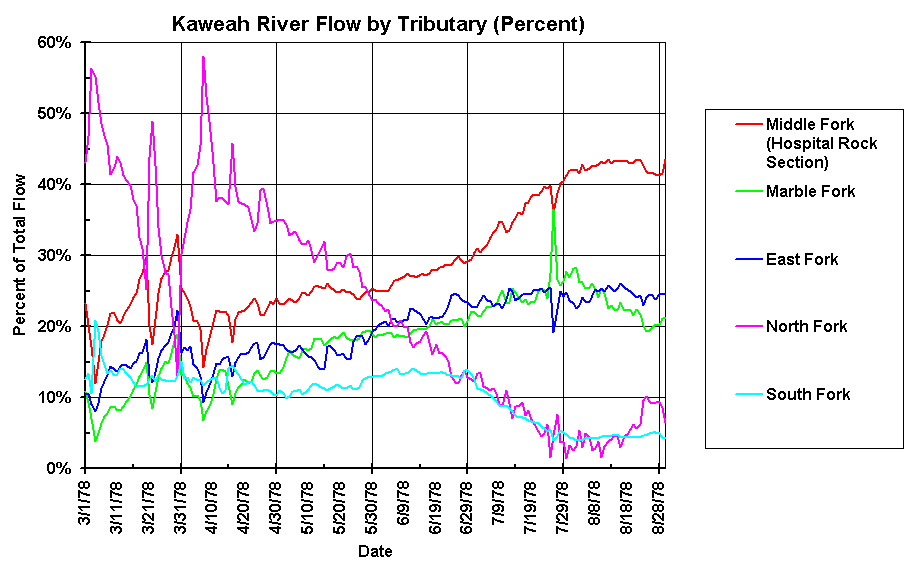 The Kaweah has significant changes in the contribution from the various tributaries depending on the time of year. Early in the runoff season, the North Fork is a major contributor and by the end of the runoff the main contributor is the Middle Fork. What this means is that the CFS Inflow to the Lake does not necessarily represent the actual flow at any one time on any one section. Additionally there is a large Flow Variation over the course of the day with the peak occurring around midnight and the low at about 6PM. Variation over the course of one day can be a high of 50% more than the low. Variations on the Dinely Bridge gauge can be half a foot or more at higher flows.